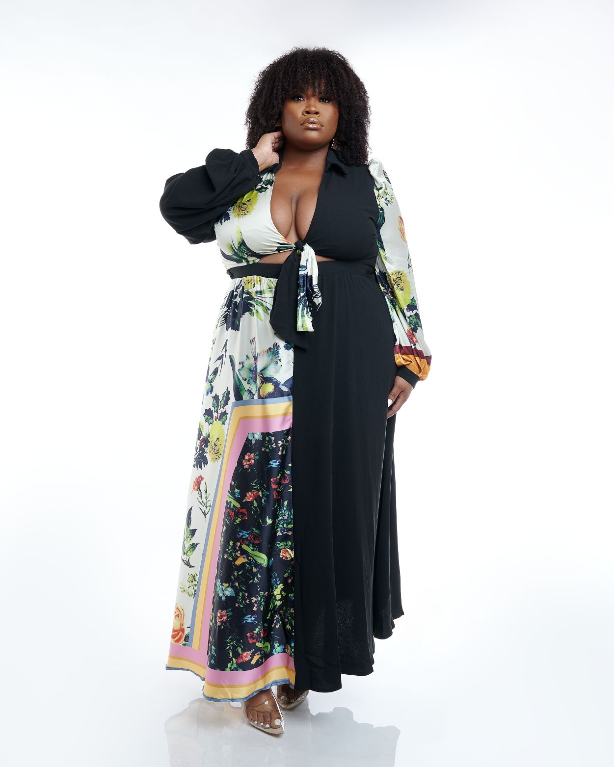 Two-Tone Tie-Front Maxi Dress features a collared neckline, darted, tie-front bodice with sassy cutout detail, and long sleeves, with button closure at the cuffs followed by an elasticized back waist top full-length maxi skirt. Partial Lining Invisible back zipper Elasticized back waist Self : 35% Rayon 60% Polyester Contrast : 100 % Polyester Lining: 100 % Polyester