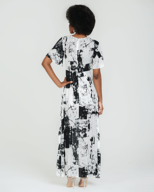 Slip this black and white maxi dress on and let the compliments flow! This stylish low cut maxi dress includes an invisible zipper that extends long in the back and just below the knees in the front.