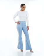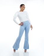 This 2 piece set features a flared pant leg and a puffed shoulder blouse. Step on the scene with this and EVERYONE will be looking!