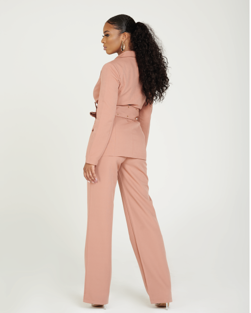 This confidence building blazer + pant set features a notch lapel collar, oversized belt, high-waist with straight leg pant fit, guaranteed to let the people know who's running things.