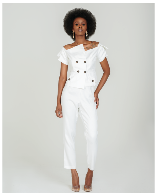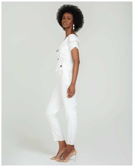 Our blazer + pant set features an off-shoulder blazer silhouette. This beauty is very versatile where the neckline can fold over or stand up. The high-waist tapered pant fit makes this the perfect piece to wear at an all-white summer party or happy hours with the girls.