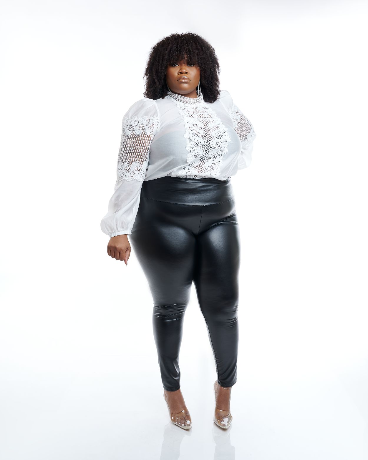 Plus faux leather high waist skinny leggings features our contoured power waistband that flattens the stomach. (Blouse sold separately)